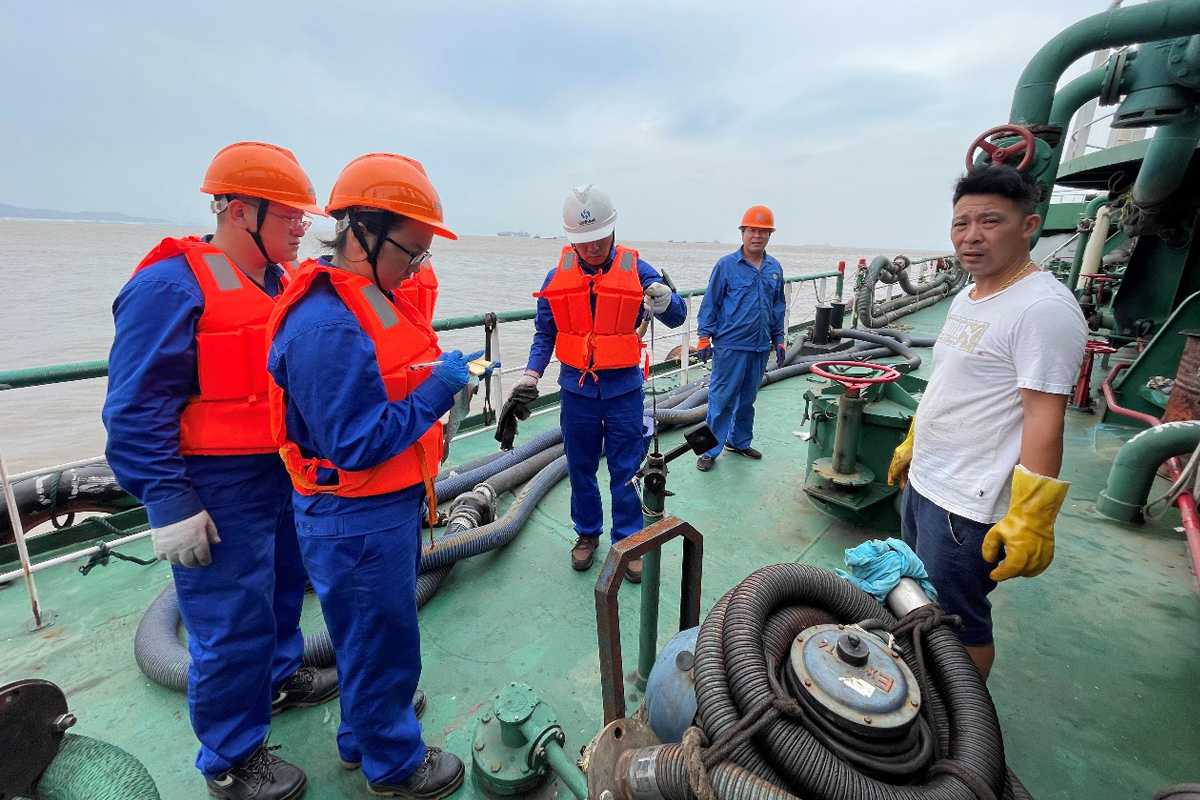 11點30分,慈航9號抵達海靖碼頭1#泊位,在海靖碼頭操作人員熟練的帶纜作業(yè)下,船舶穩(wěn)穩(wěn)的停靠在碼頭上,待架設(shè)好懸梯后,化驗班組的員工登船進行油樣采集、量尺作業(yè),隨后接輸油管往油罐抽取油污水。