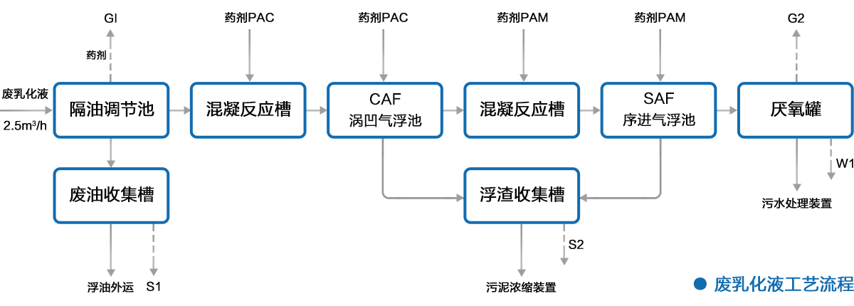 經(jīng)廢乳化液處置后的廢水進入污水處理站再行凈化,最后達標(biāo)排放。
