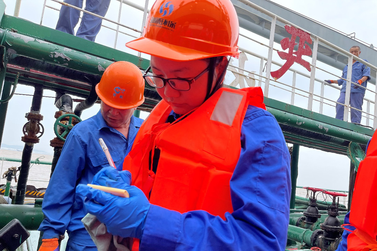 11點30分,慈航9號抵達海靖碼頭1#泊位,在海靖碼頭操作人員熟練的帶纜作業(yè)下,船舶穩(wěn)穩(wěn)的停靠在碼頭上,待架設(shè)好懸梯后,化驗班組的員工登船進行油樣采集、量尺作業(yè),隨后接輸油管往油罐抽取油污水。
