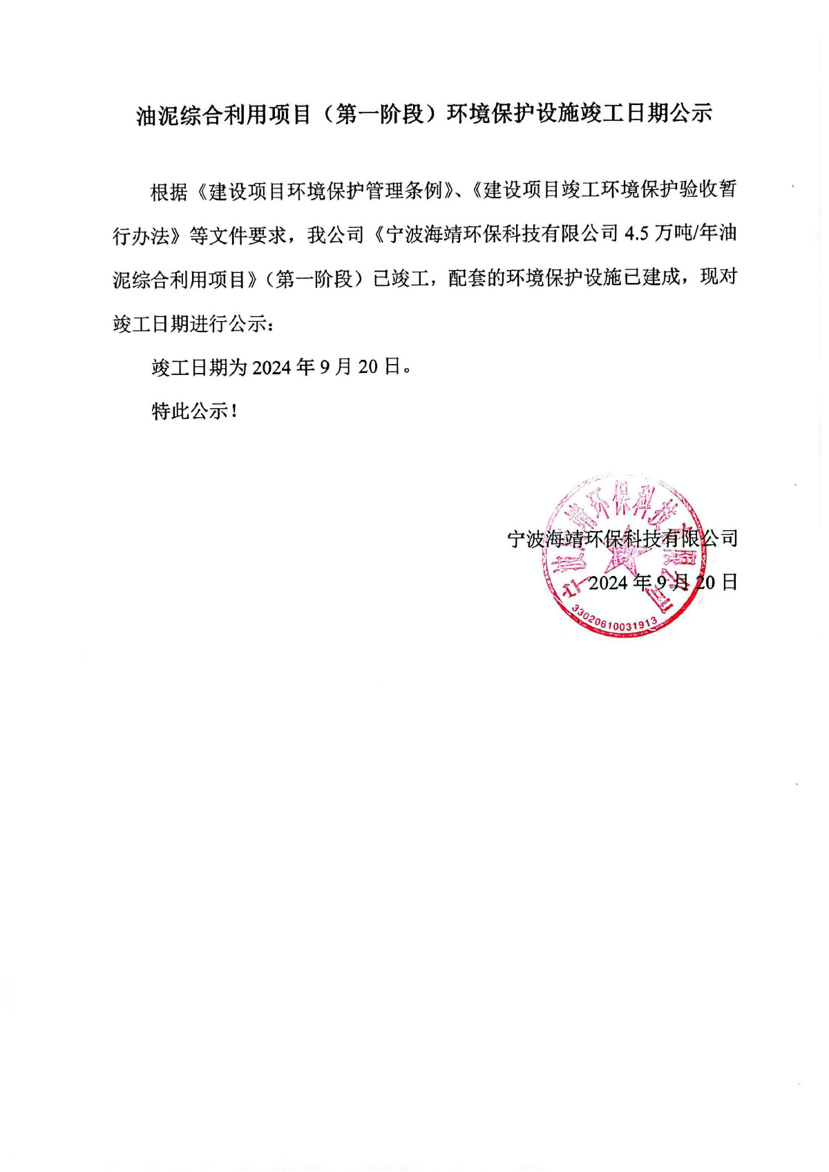 油泥綜合利用項目(第一階段)環(huán)境保護設施竣工日期公示