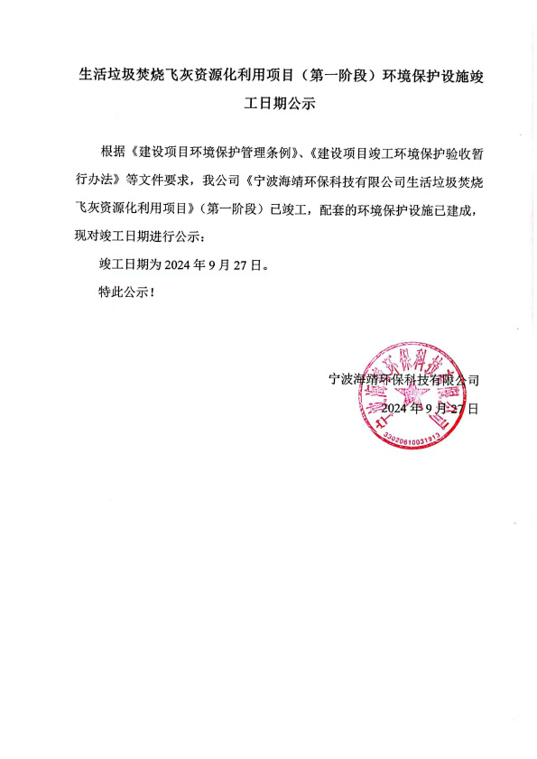 活垃圾焚燒飛灰資源化利用項(xiàng)目(第一階段)環(huán)境保護(hù)設(shè)施竣工日期公示