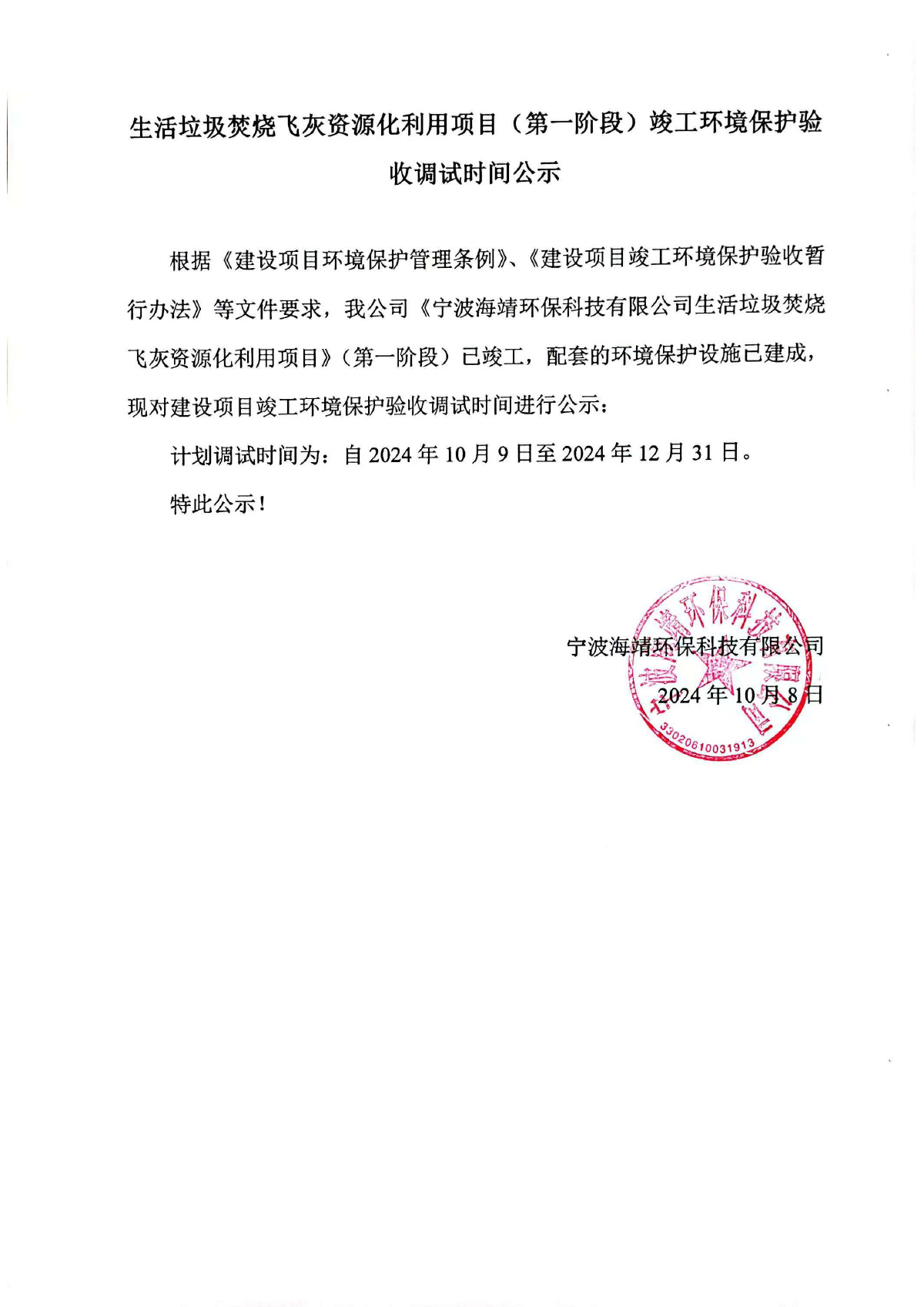 生活垃圾焚燒飛灰資源化利用項(xiàng)目(第一階段)竣工環(huán)境保護(hù)驗(yàn)收調(diào)試時間公示