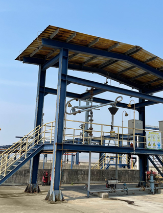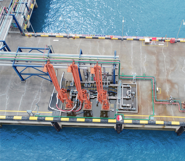 配有三根輸油臂,輸送管線管徑為DN200,每小時(shí)可接卸產(chǎn)品100噸以上,同時(shí)也可將產(chǎn)品裝船下海。
